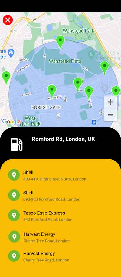 The Gas Station locator helps you find fueling stations around a particular location, the app displays the stations on an interactive map, with a details list of stations (station name & address)